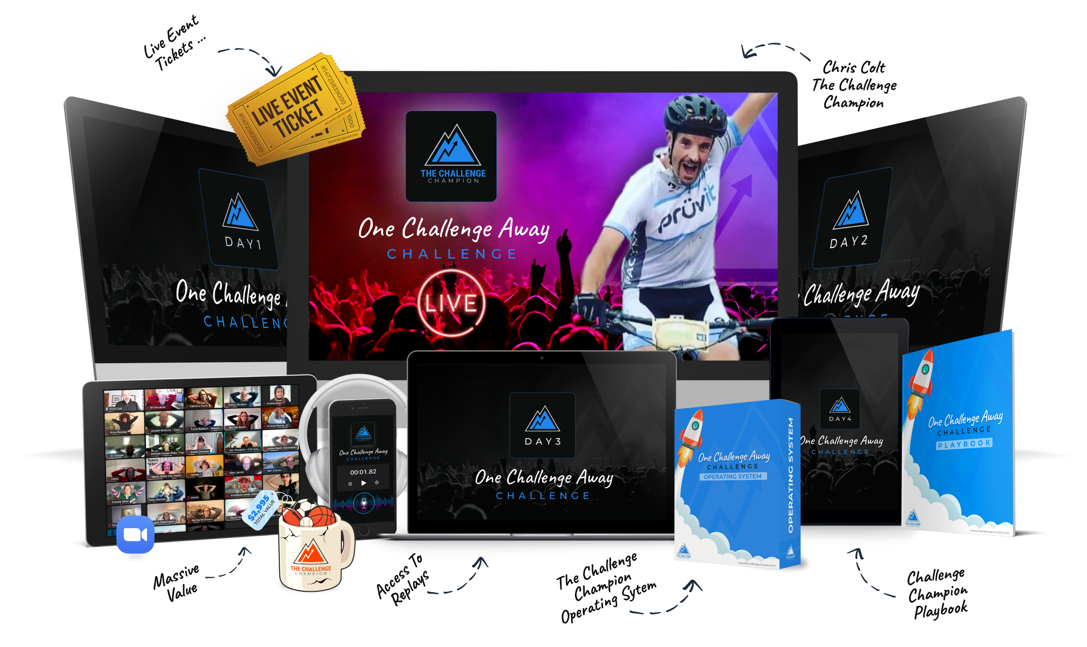 2) Access To The One Challenge Away Challenge. My flagship challenge done over 15 times and now available on Evergreen only. Over 5- 60 minute sessions you will discover the key to scalable client acquisition from one 5-day challenge. Access granted after our 1-1 consultation call. (Value $150)